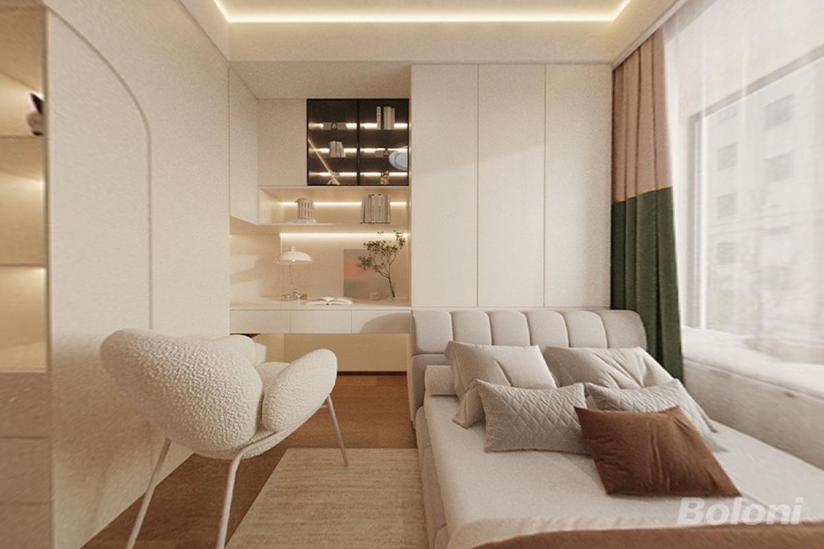 这个空间以柔和米白为基底,通过无主灯设计与悬浮收纳柜营造通透感。沙发区与工作区自然衔接,撞色窗帘与层次抱枕增添温暖质感,在极简线条中实现功能与美学的平衡,打造出松弛治愈的多功能居住场景。