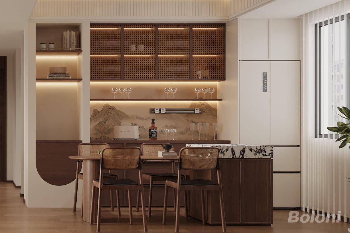 这个餐酒区以浅米与深棕为基调,将藤编格栅、山水岩板与温润木质巧妙融合。暗藏灯带勾勒出层次丰富的视觉效果,半开放收纳柜与嵌入式冰箱实现功能与美学的统一,藤编餐椅与岩板岛台柔化空间质感,打造出兼具东方雅致与现代实用的用餐场景。