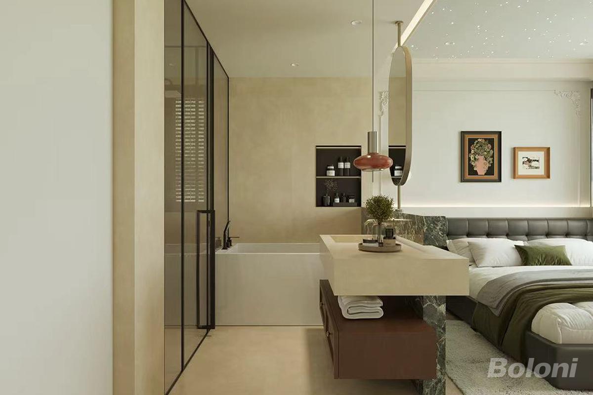 1. 空间规划与功能融合 功能区无缝衔接:卧室与卫浴区半开放连通,既保证了空间的通透感,又让洗漱、沐浴、就寝的动线变得非常流畅,特别适合追求高效起居体验的居住者。 干湿分区清晰:卫浴区用玻璃隔断划分出淋浴区,既实现了干湿分离,又不会遮挡光线,保持了空间的开阔感。 过渡自然舒适:洗漱台作为卧室与卫浴的过渡节点,兼具收纳与展示功能,让空间转换更柔和,也丰富了视觉层次。