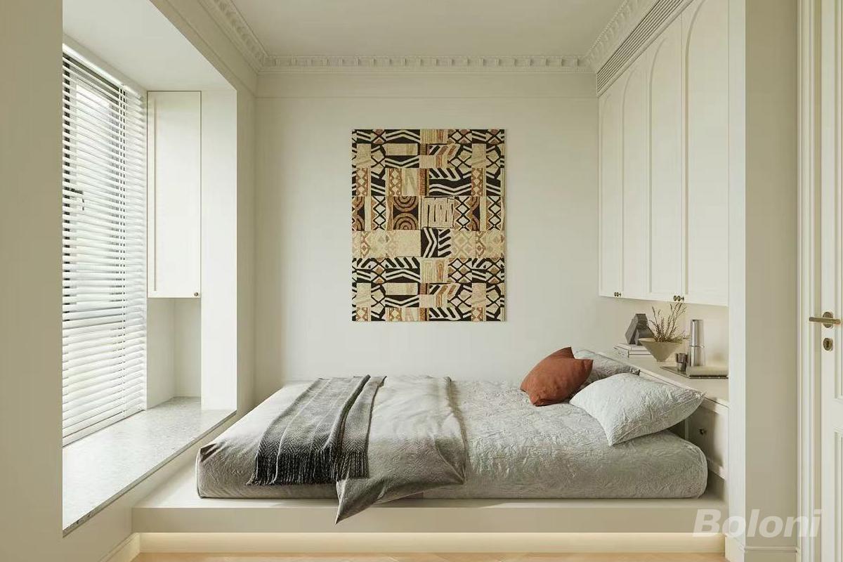 地台床设计节省空间:地台床不仅视觉上更轻盈,还能与飘窗无缝衔接,有效释放了地面空间,让小卧室也显得开阔通透。 收纳能力充足:墙面一整排的顶天立地柜提供了强大的储物功能,同时保持了立面的整洁感,兼顾美观与实用。 飘窗功能化:与地台床相连的飘窗,既可以作为观景休闲区,也能作为临时的置物或休憩空间,拓展了卧室的使用场景。
