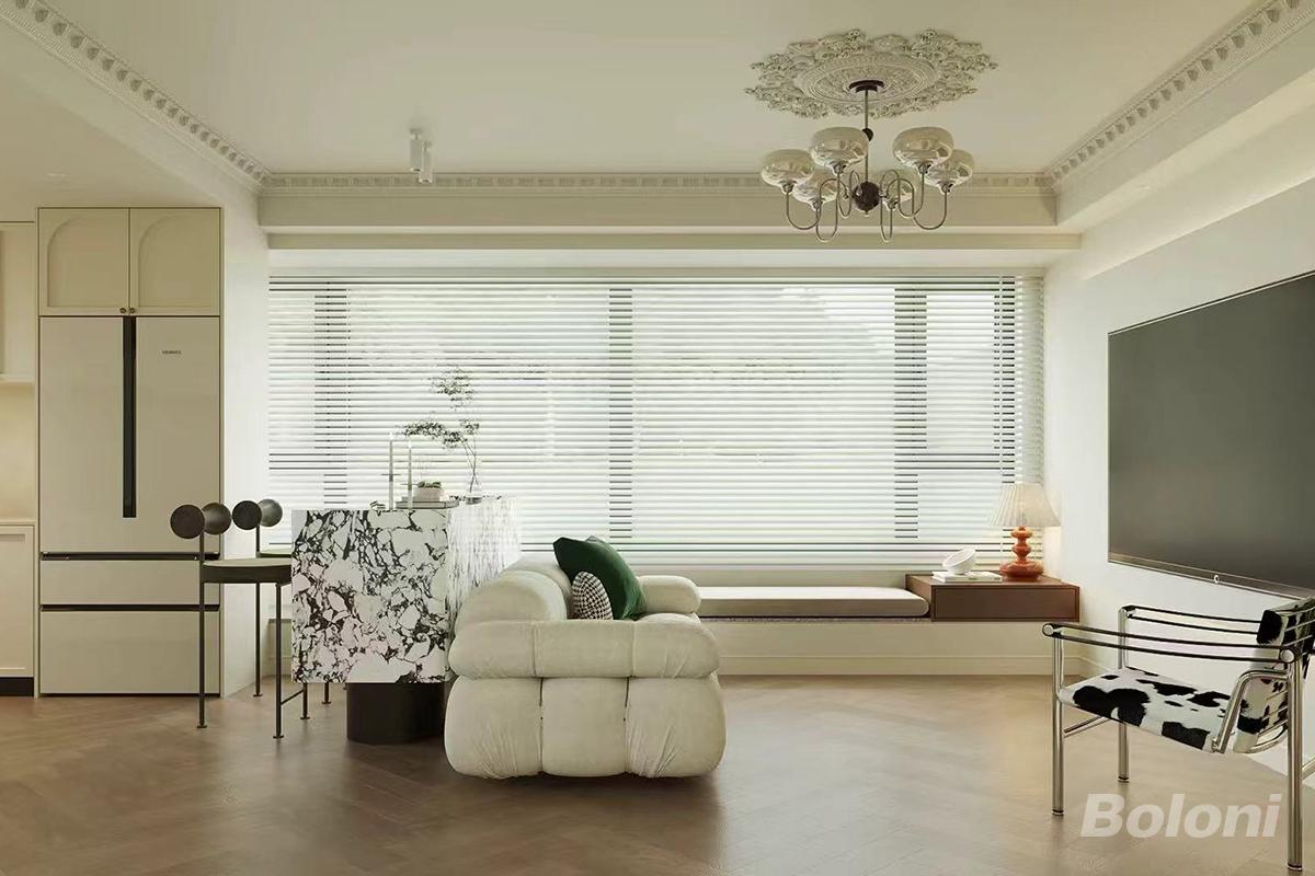 法式与现代的优雅融合:天花板的雕花石膏线、复古吊灯是法式元素的点睛之笔,搭配现代感的云朵沙发、艺术感中岛台,既有浪漫精致的格调,又不失松弛舒适的现代感。 色彩与质感的平衡:以米白为基调,搭配黑白纹理的艺术墙面、奶牛纹单椅和橄榄绿抱枕,色彩对比柔和且层次丰富,营造出高级又治愈的空间氛围。 细节营造仪式感:艺术照片墙、弧形门洞和精致的石膏线造型,让空间处处充满细节,提升了整体的精致度和氛围感。