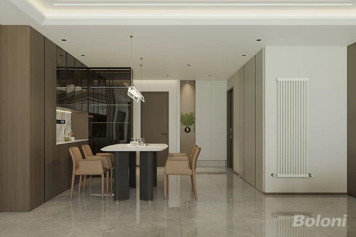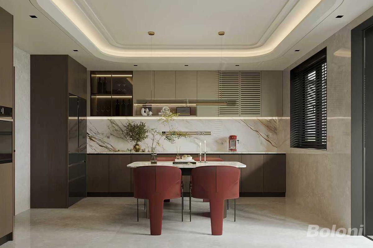 餐厨一体化设计:中岛台与餐桌无缝衔接,让备餐、用餐和社交的动线非常流畅,既提升了空间利用率,也增强了家人之间的互动感。 中西厨功能融合:橱柜既满足了中式烹饪的储物需求,也预留了西式操作台面和嵌入式电器位,适配现代多元的烹饪方式。 收纳能力充足:顶天立地的橱柜与玻璃酒柜组合,既提供了强大的储物功能,也能展示藏品,兼顾实用与美观。