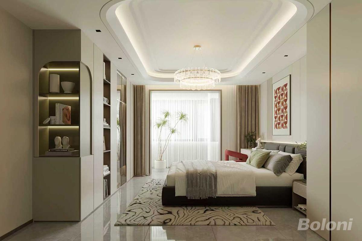 现代轻奢风格高级感:以米白、浅灰为基调,搭配水晶吊灯、金属线条和艺术挂画,营造出优雅精致的睡眠氛围,既显档次又不失温馨。 色彩层次丰富和谐:橄榄绿、浅灰抱枕与红色休闲椅形成柔和的色彩对比,艺术地毯与装饰画为空间注入活力,让整体氛围松弛又有质感。 灯光层次细腻舒适:悬浮吊顶的氛围灯带、水晶主灯与背景墙的线性灯结合,满足了不同场景的照明需求,也提升了空间的氛围感。