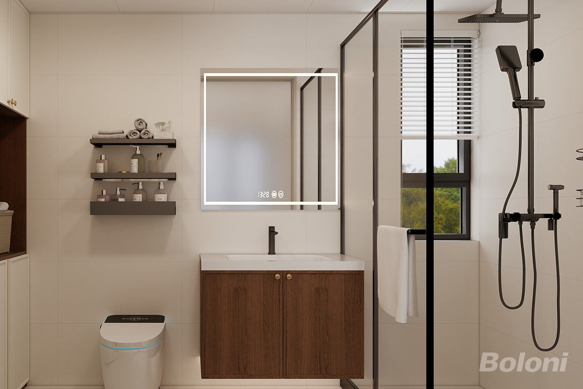 中古风卫生间,深棕木纹浴室柜搭配米白墙面,智能马桶、带灯镜柜与玻璃隔断淋浴区功能清晰,黑色五金与悬浮置物架提升了整体质感与实用性。