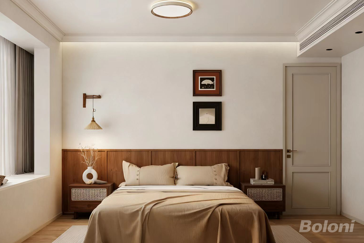 卧室以暖棕与米白为主调,木质感床头搭配柔光灯饰,营造出松弛治愈的氛围,简约挂画与软装细节尽显温润雅致的舒适感。