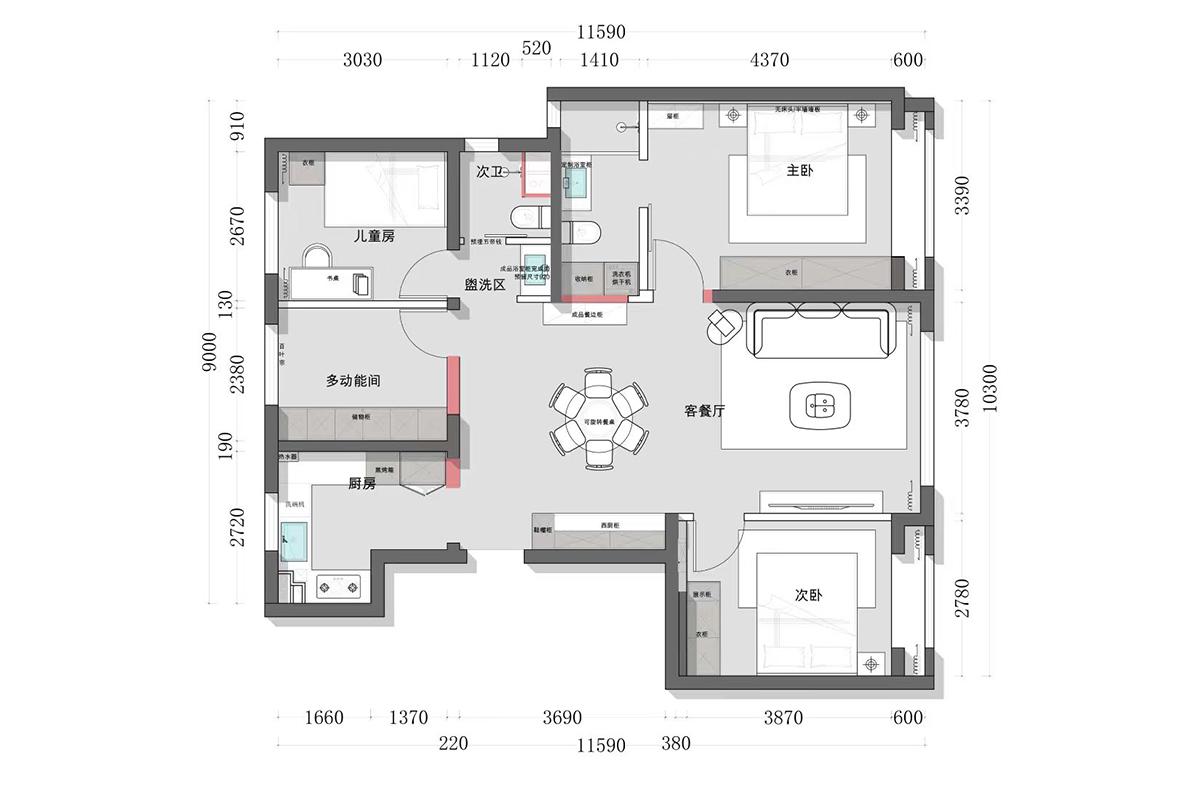 该户型多房间布局实用,但动线稍乱、空间利用率待提升,多居室适配多元居住需求,基础功能区齐全。动线交叉显局促,部分空间易闲置。梳理动线,将闲置小空间改储物区,利用墙体做嵌入式收纳,提升空间利用率。