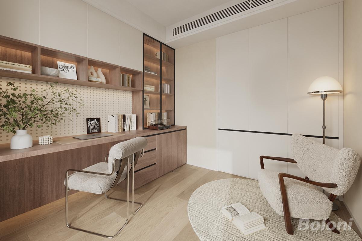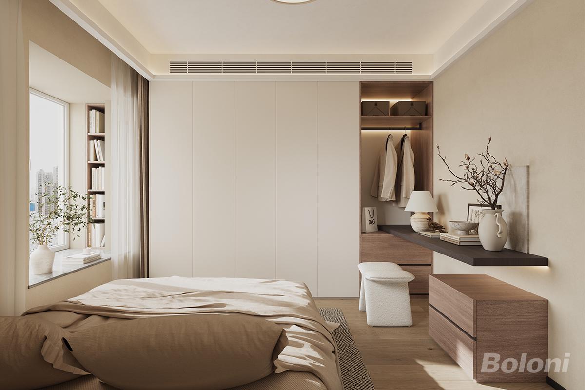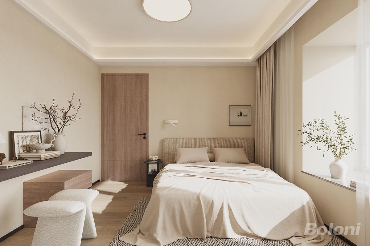 卧室以燕麦色墙面、浅木色地板和米白色床品构成饱和大地色系基调、搭配深木色的悬浮置物台和浅木色房门、营造温馨治愈的氛围、搭配两侧的悬浮置物台与矮凳,兼具收纳与展示功能;靠窗区域利用窗台打造小型绿植角,既丰富了空间层次又保持了良好的通透感。