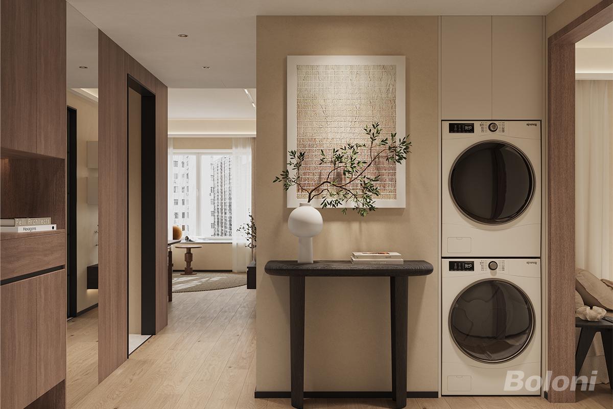 玄关设计以浅木色地板、燕麦色墙面和深木色柜体为主、构成低饱和度的大地色系基调、极简的黑色玄关桌搭配白色粗陶花瓶点缀绿植、通过材质的自然肌理以及线条干净的单品和自然元素、共同营造出宁静质朴的氛围并传递松弛的生活感。