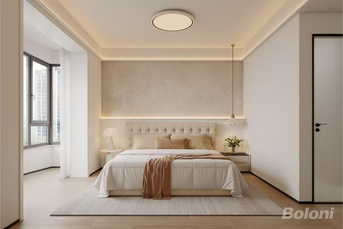 • 以奶白色为基底,墙面采用微水泥质感的浅米色涂料,搭配浅木色地板,营造出柔和的包裹感。 • 软包床头采用同色系拉点设计,搭配线性灯带,弱化了床头与墙面的边界,提升了空间的精致度。 • 无主灯设计+环形吸顶灯,搭配床头两侧的简约灯具,光线柔和不刺眼;大面积落地窗引入充沛自然光,让整个空间在简约中透着治愈感。
