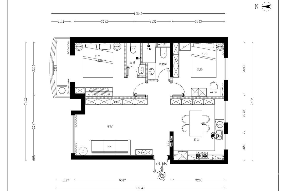客厅与餐厅无硬性隔断,通过顶面无主灯设计与地面同色系材质,强化空间开阔感,契合原木风的温润通透 动静分区极致清晰:公区(客厅、餐厨)集中于户型中下部,私区(主卧、次卧)位于上部,以走廊形成天然隔断,兼顾公共互动与私密休憩。