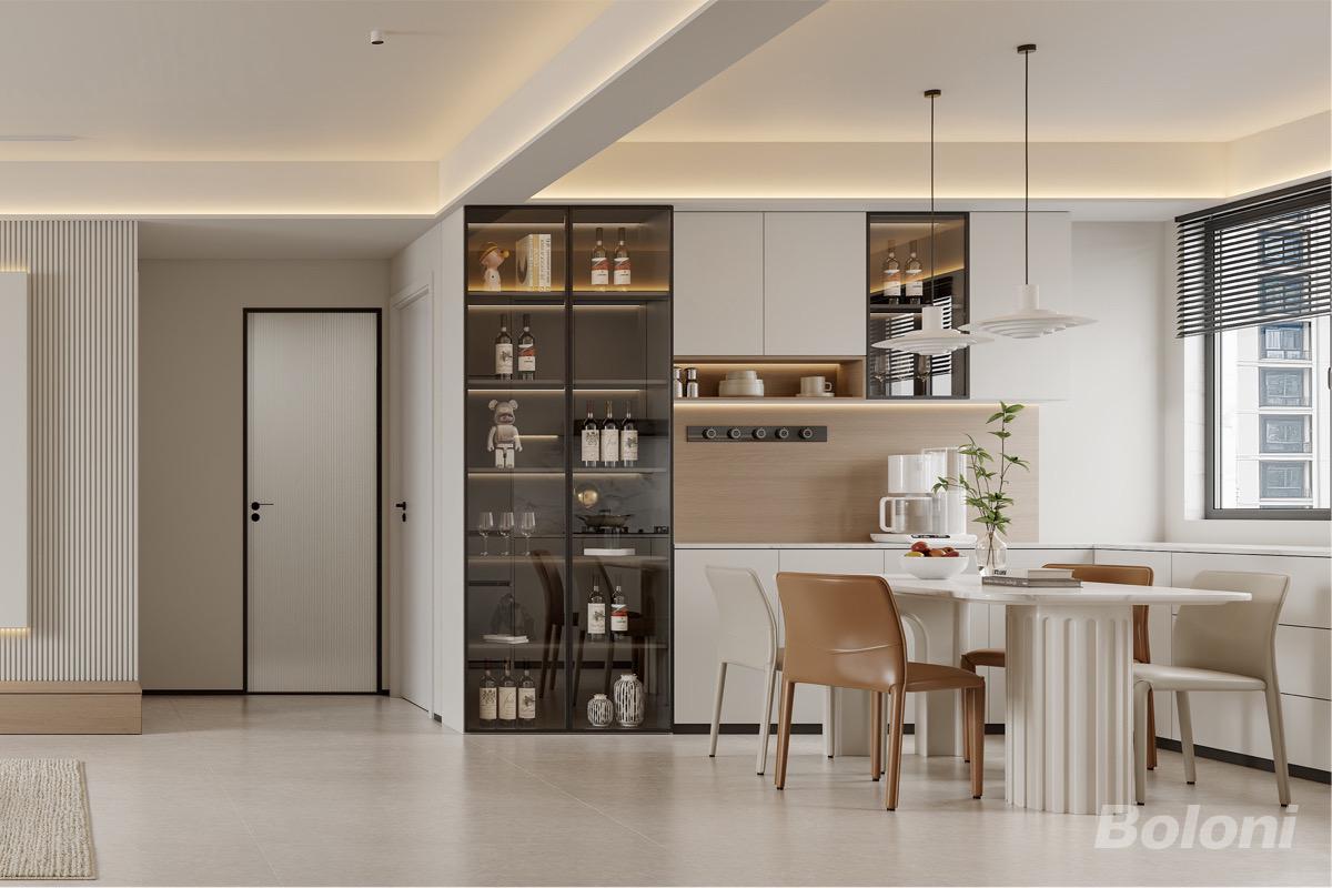 开放式餐厨设计,奶白色定制餐边柜与原木色操作台形成材质碰撞,玻璃酒柜嵌入柜体,兼顾展示与收纳;悬浮式吊顶搭配简约吊灯,浅色系餐椅与原木色单椅混搭,大理石墙面点缀厨房区,让烟火气与奶油原木风的精致感完美相融,每一处细节都藏着对日常的用心。