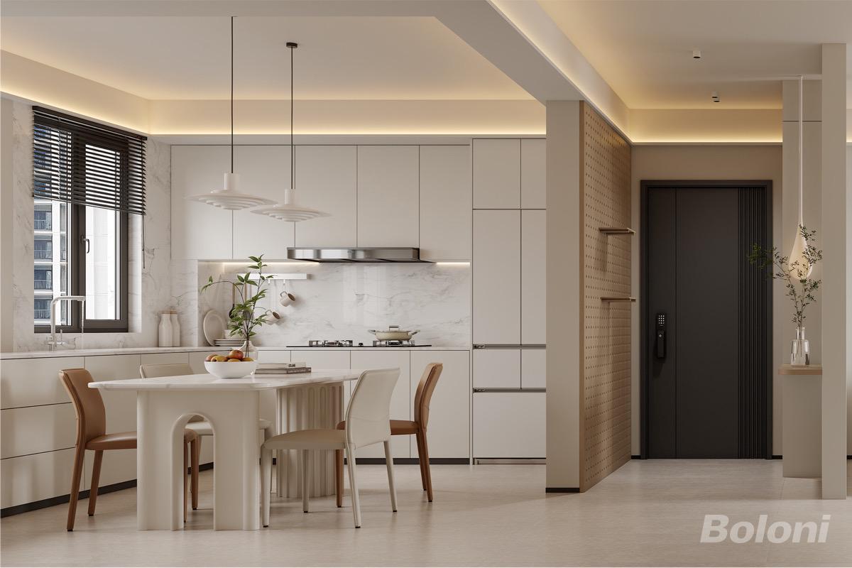 厨房采用奶白色柜门+浅原木色台面,大理石防溅墙提升质感;入户门选用深灰色,与奶油原木的浅色调形成对比,强化空间层次;立柱采用穿孔板设计,兼顾装饰与实用,餐台与厨房操作台无缝衔接,动线流畅,让奶油原木风在实用场景中依然保持高级感。