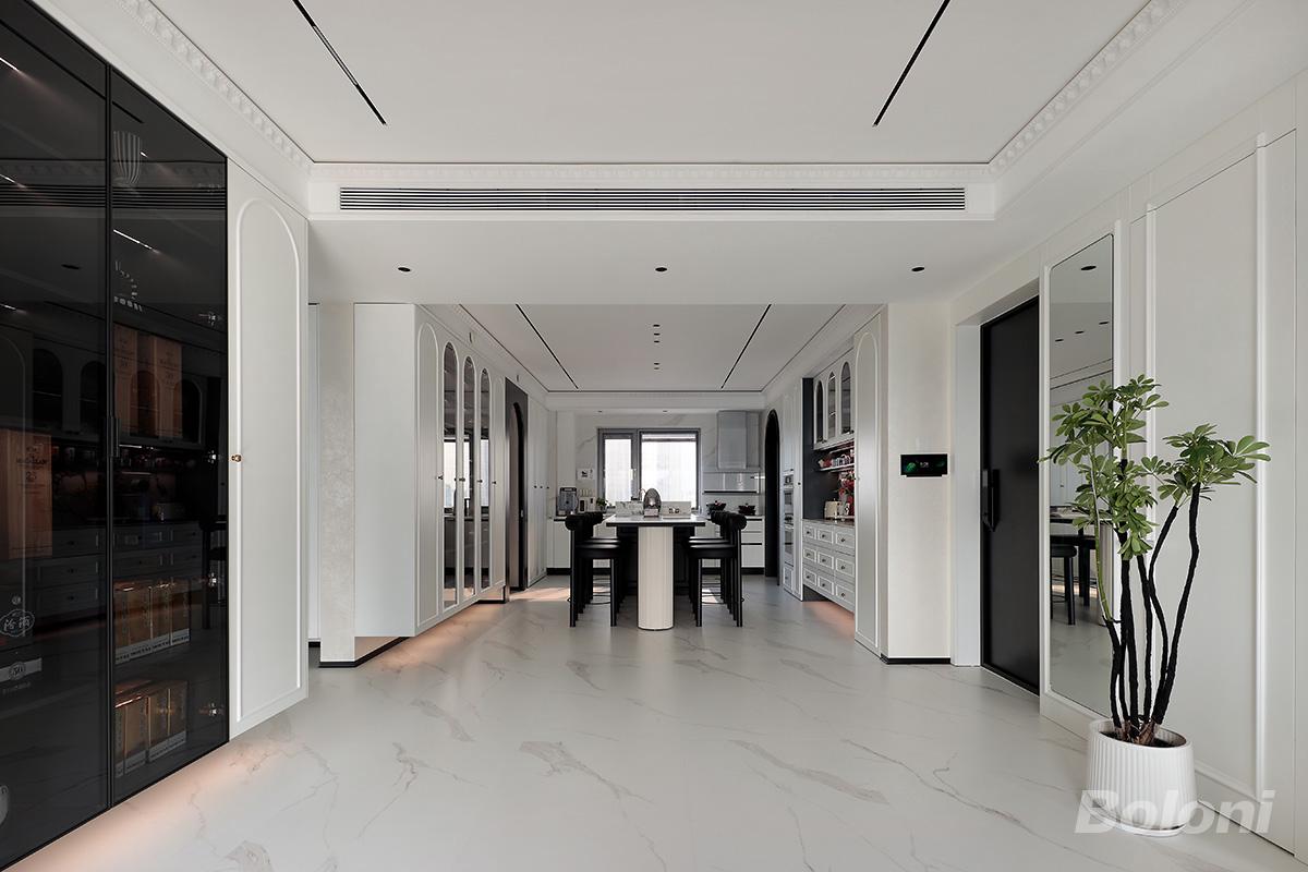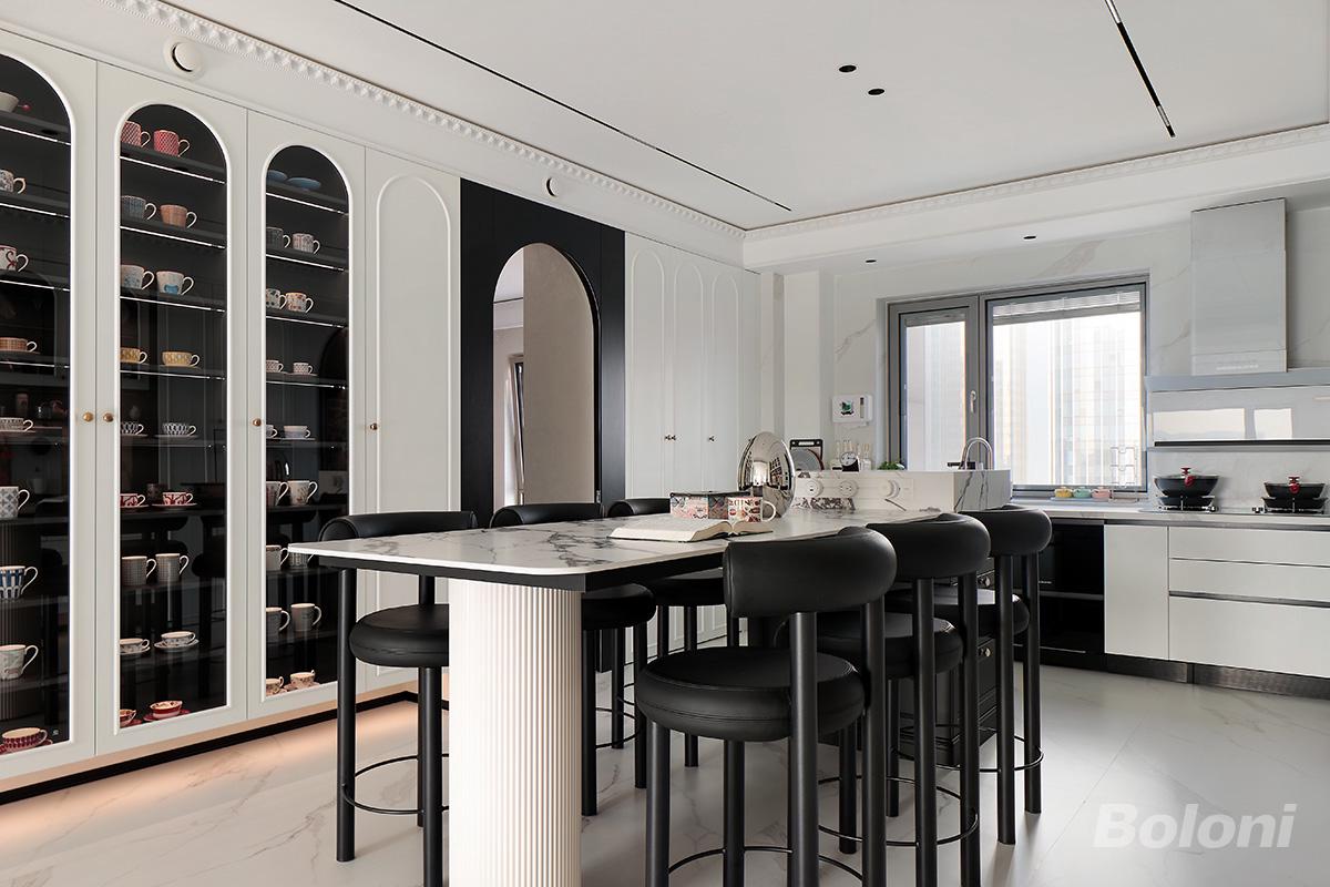 以纯净的米白与浅灰作为基底,搭配大面积浅纹大理石地面,奠定空间的轻盈与高级感;黑色玻璃柜门与中岛椅作为视觉锚点,形成沉稳与灵动的对比,而金色五金、拱形护墙板等经典元素,则在细节处致敬法式美学,同时避免了传统风格的厚重与沉闷。