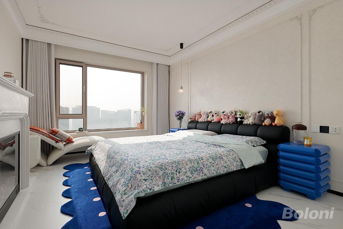 在空间布局上,以大床为视觉中心,通过通透的落地窗引入充足自然光,让城市天际线成为天然背景,最大化提升空间开阔感;顶面精致的石膏线与单头吊灯设计,既保留了法式的优雅轮廓,又通过柔和的光影营造出静谧的休憩氛围。