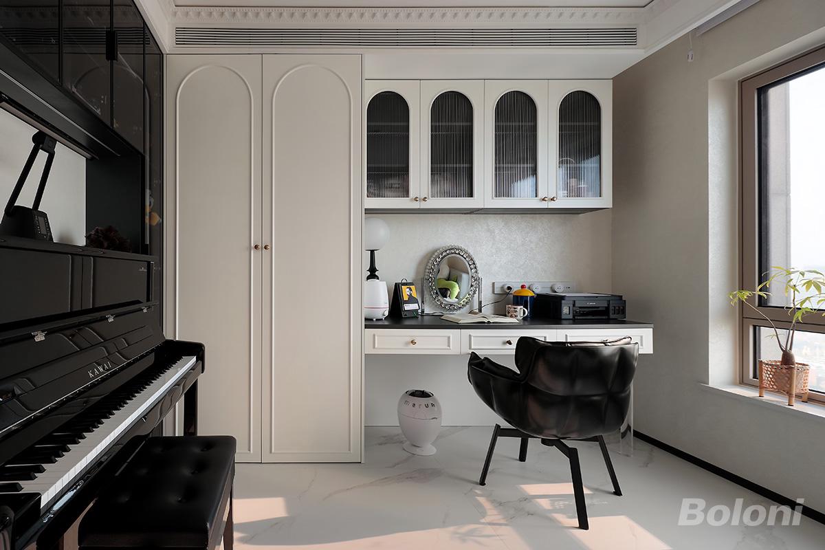 空间布局上采用一体化定制设计,将通顶储物柜、悬浮式书桌与梳妆区无缝衔接,最大化利用墙面空间,同时划分出清晰的功能分区;左侧预留钢琴摆放区域,让艺术氛围与办公场景自然共生,落地窗则为空间引入充沛自然光,消解了封闭感。