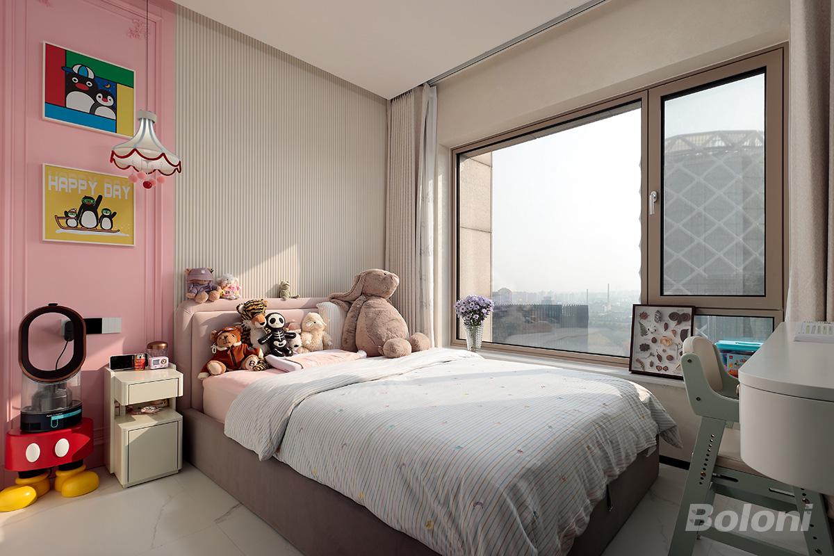 色彩与材质上,以柔和的粉色护墙板与浅灰竖纹墙面为基底,搭配浅纹大理石地面,奠定空间的温柔与高级感;浅粉软包床架作为视觉锚点,形成温馨与灵动的对比,而卡通挂画、米奇造型收纳柜与满床毛绒玩偶等童趣单品,则为空间注入活力与生活气息,打破了传统法式的沉闷。