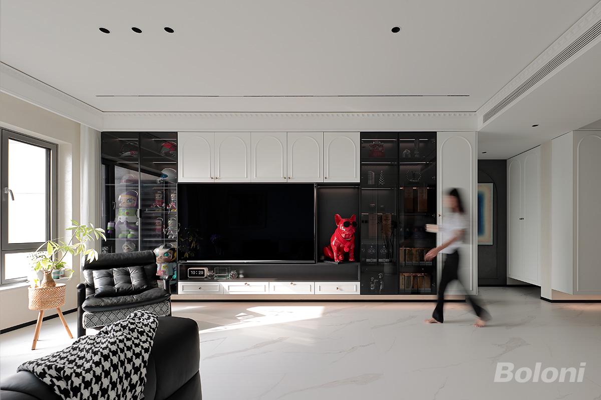以纯净的米白与浅灰作为基底,搭配大面积浅纹大理石地面,奠定空间的轻盈与高级感;黑色皮质沙发与单人椅作为视觉锚点,形成沉稳与灵动的对比,而红色艺术雕塑、复古边几等个性单品,则为空间注入活力与艺术气息,打破了传统法式的沉闷。