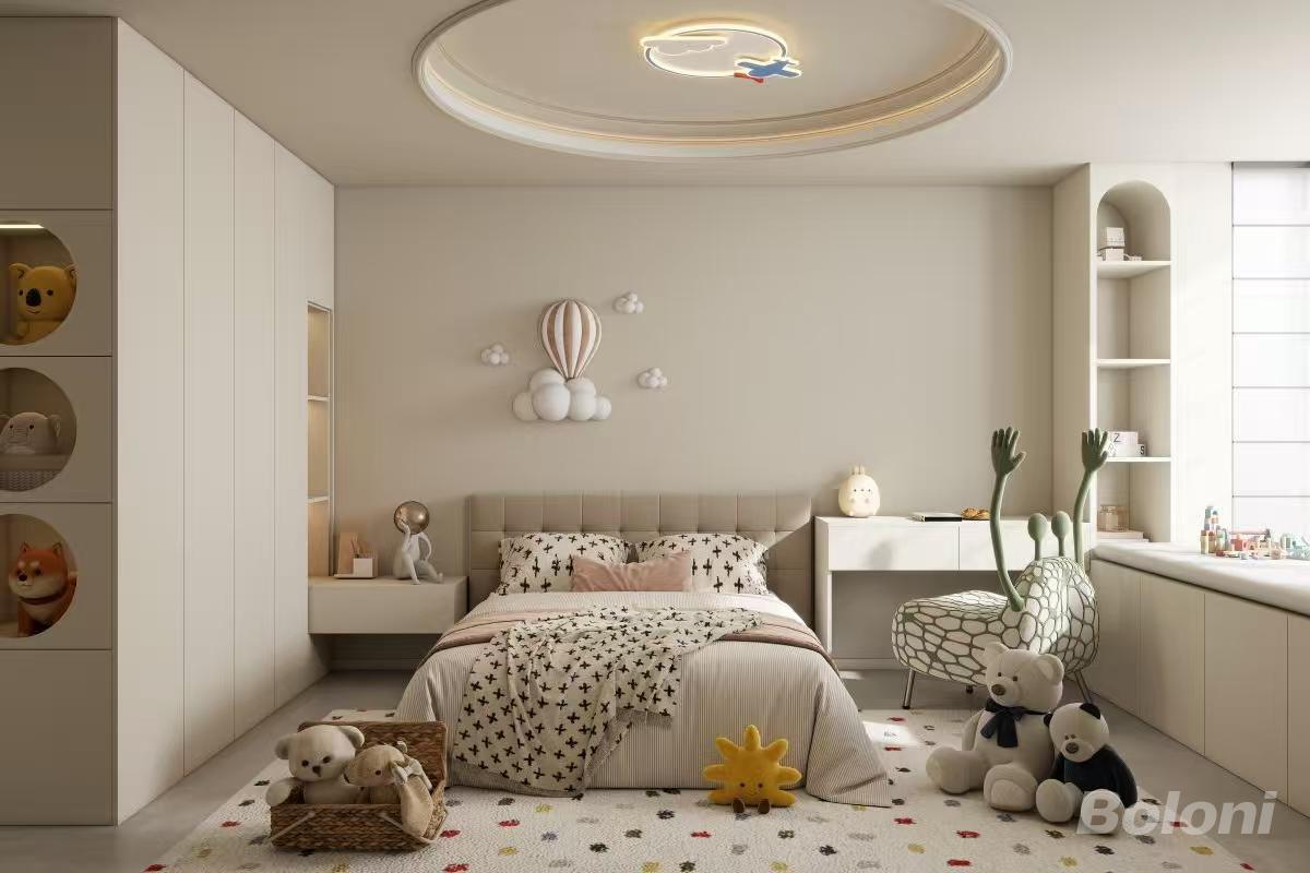 推开房门的瞬间,奶 fufu 的米杏调裹着软乎乎的气息扑过来 —— 墙面是带着细腻肌理的暖杏色,石膏线雕花顺着墙沿勾出轻甜的法式优雅,不是厚重的华丽,是像奶油泡芙一样的柔润精致。
