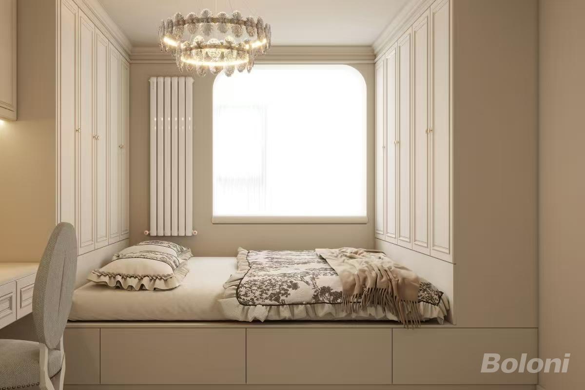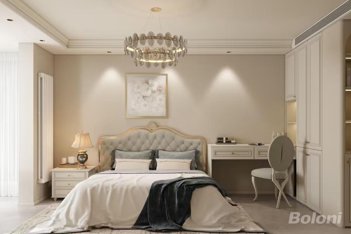 卧室延续了整体的柔和色调,床头背景墙的线条设计与客厅相呼应,保持了风格的统一性。水晶吊灯散发着精致光芒,为空间增添了浪漫氛围。飘窗区域布置得温馨舒适,是阅读、观景的好地方。