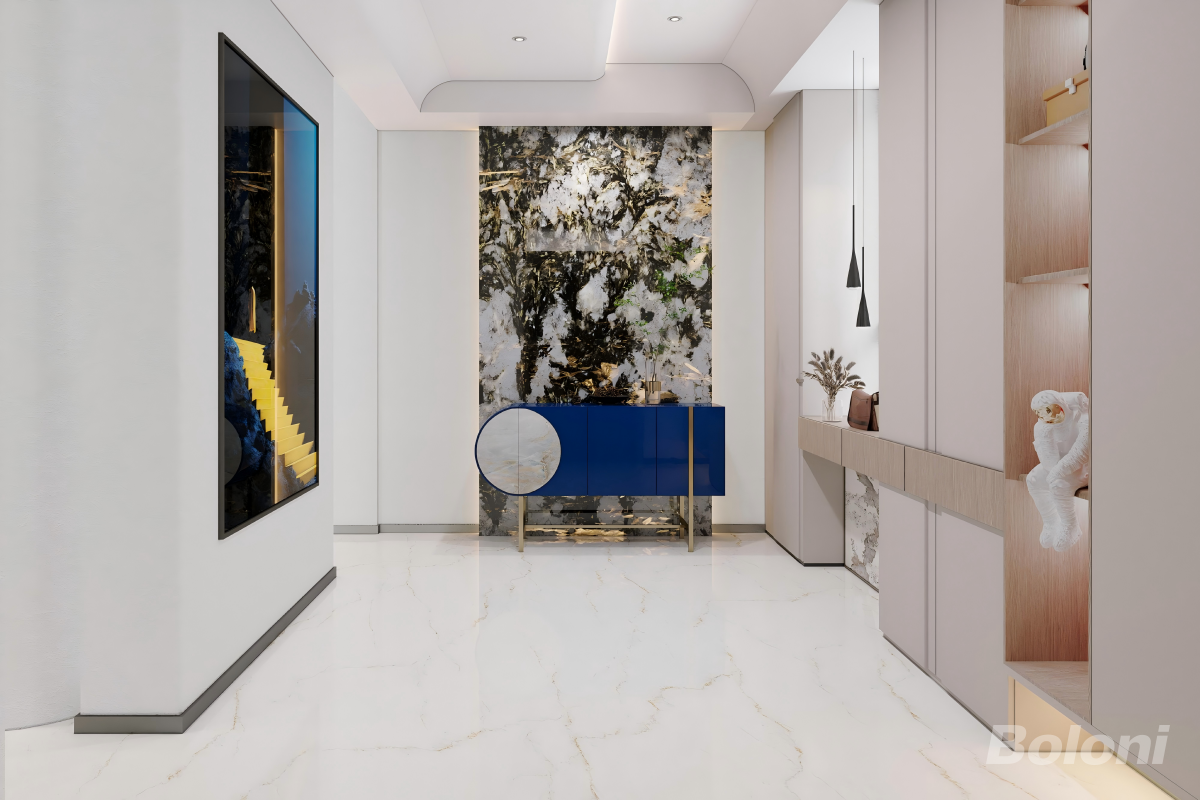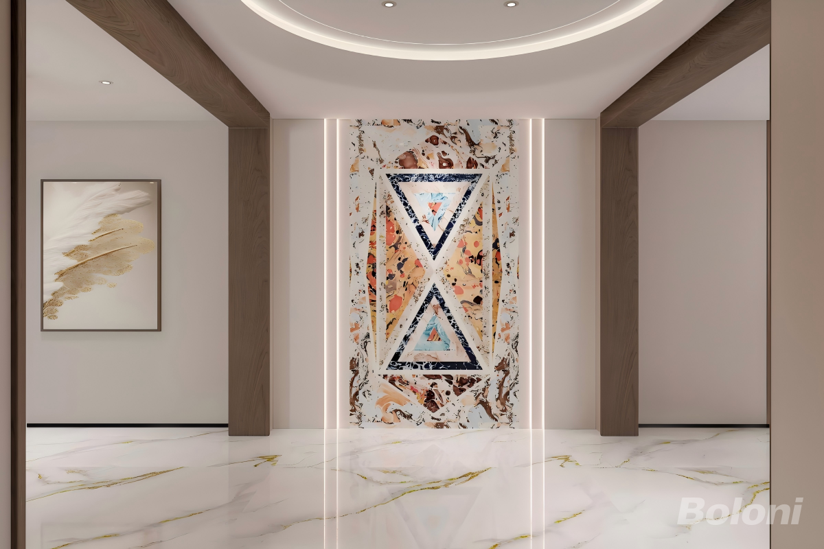 过道以艺术化过渡为设计核心,作为各功能区的动线枢纽,弱化通道的单调感。中央艺术大理石背景墙以丰富纹理与几何造型成为视觉焦点,搭配线性灯带强化层次;两侧木作框架与全屋色系统一,保持风格整体性。地面大面大理石呼应整体质感,动线流畅自然,让过渡空间兼具仪式感与通透感,成为地下室的视觉亮点,提升整体空间格调。