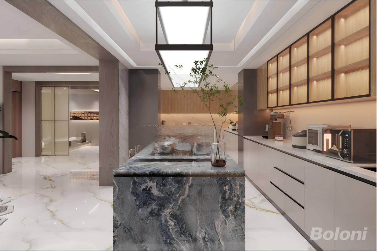 B1 地下室厨房以高效烹饪与社交互动为核心,打造餐厨一体化的实用美学空间。布局遵循 “洗 - 切 - 炒” 黄金动线,中岛台与操作区自然衔接,兼顾烹饪与轻食社交。定制柜体依空间尺度定制,玻璃柜门与木作结合,兼顾收纳展示,与全屋色系统一。中岛台面甄选纹理独特的奢石,与地面大理石呼应,弱化地下空间封闭感;灯光兼顾操作与氛围,让烹饪从容雅致,成为兼具烟火气与高级感的核心餐厨区。