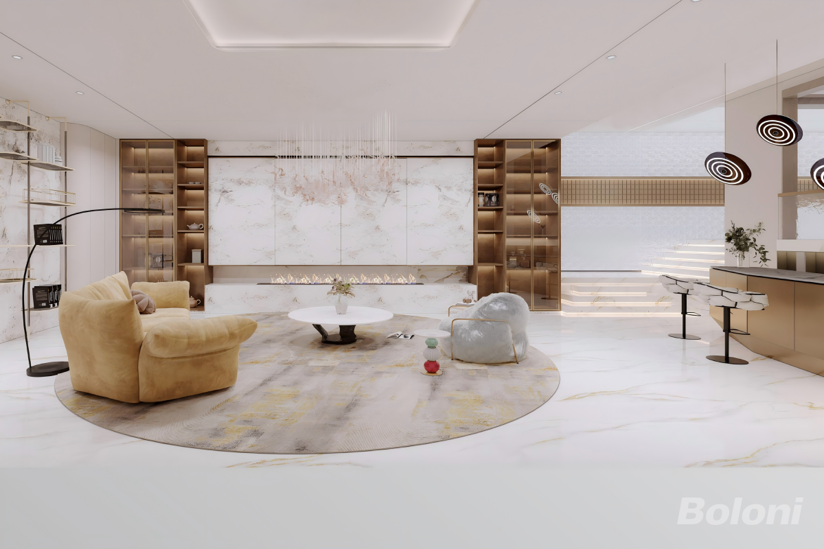 空间以大面积大理石与木作玻璃柜体为基底,色调温润统一;线性灯带与艺术吊灯交织,壁炉设计提升温度感,营造松弛氛围。休闲家具布局舒朗,兼顾家庭日常休憩与亲友社交互动。整体删繁就简,将质感美学与实用功能相融,成为地下室兼具格调与温度的核心休闲空间。