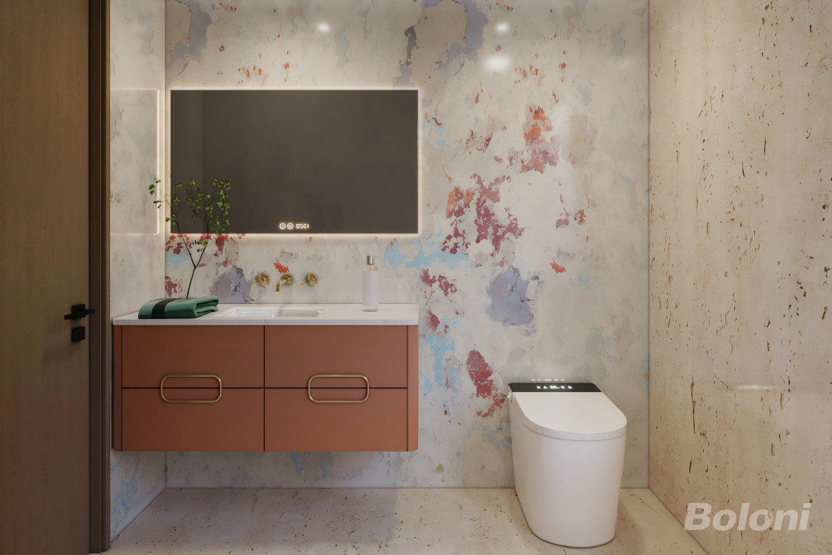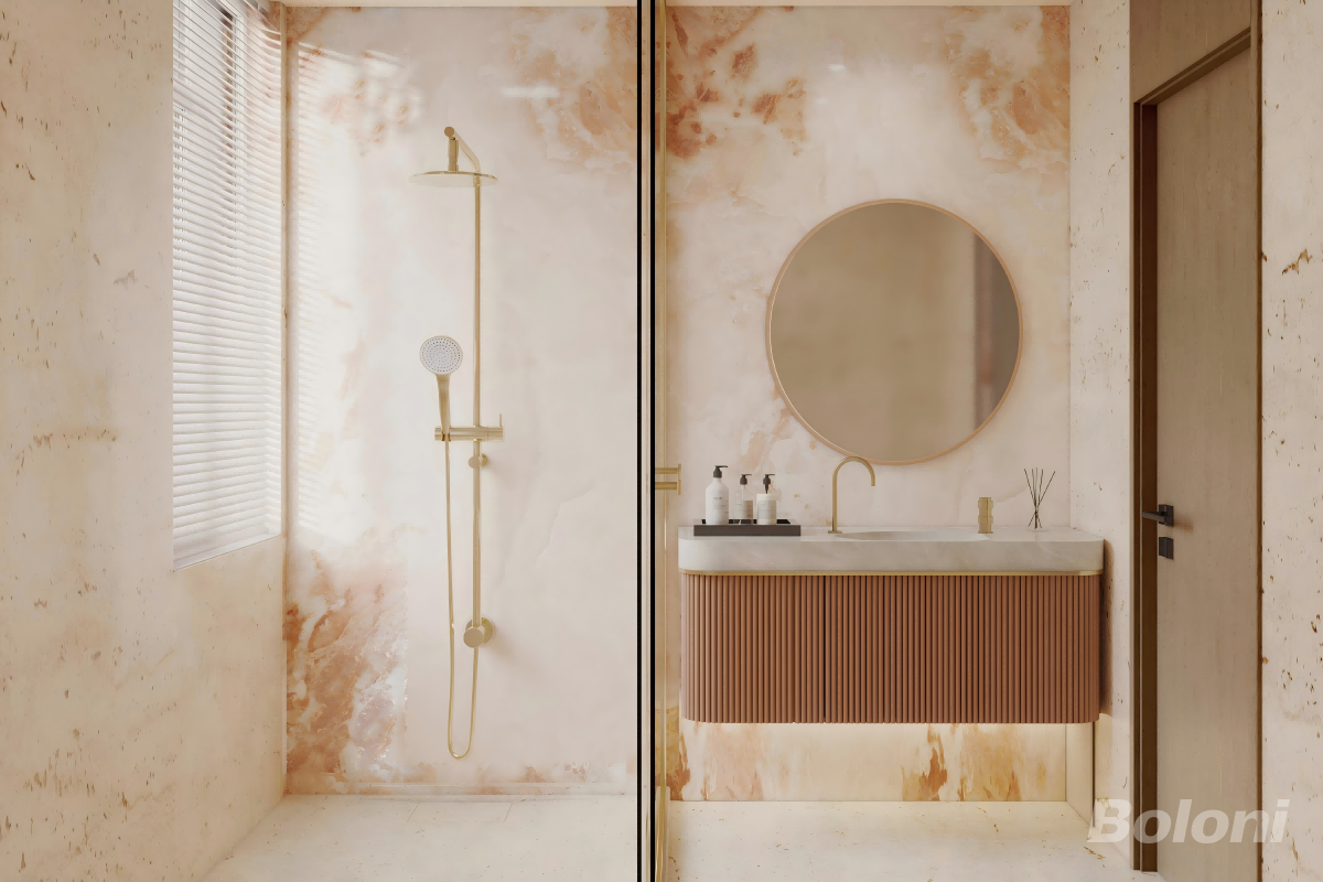 女孩房卫生间以柔润精致为设计核心,打造适配少女审美与使用需求的专属卫浴空间,整体风格与女孩房相呼应,兼具颜值与实用性。空间甄选**蜜蜂瓷砖**铺贴,质感细腻、花色雅致,以温润的肌理与柔和的色调,勾勒出少女卫浴的清新氛围,兼顾美观度与耐用性。卫浴柜体为木板现场定制,与全屋木作色系统一,合理规划洗漱、收纳分区,动线流畅,让精致质感融于每一处细节,打造舒适又贴合少女气质的卫浴体验。