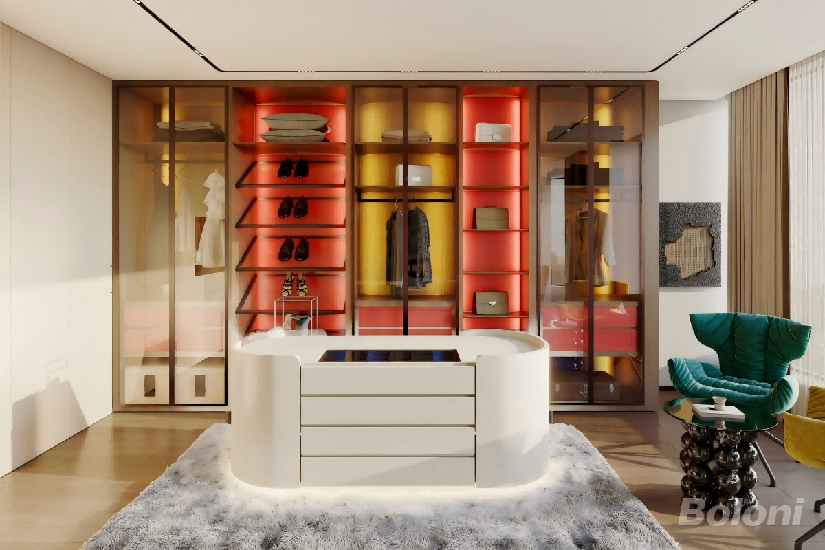 衣帽间为卧室延伸的专属收纳空间,为了让收纳功能更贴合日常使用需求,依据空间格局做了定制化分区规划;为了保证与主卧及主人层整体颜色与风格的统一,衣帽间的柜体与主卧柜体相同,都是用木板现场制作的(木作现场制作的优势在于:可以基于衣帽间的空间尺度严丝合缝地嵌入柜体,形式多变且收纳分区可灵活设计),且保持与卧室地板的统一色系,让收纳空间兼具实用性与视觉的整体性。