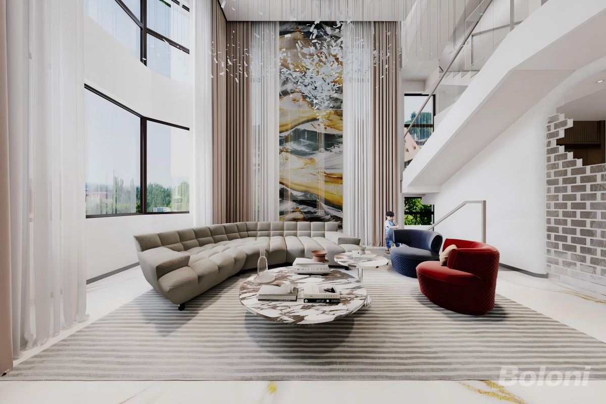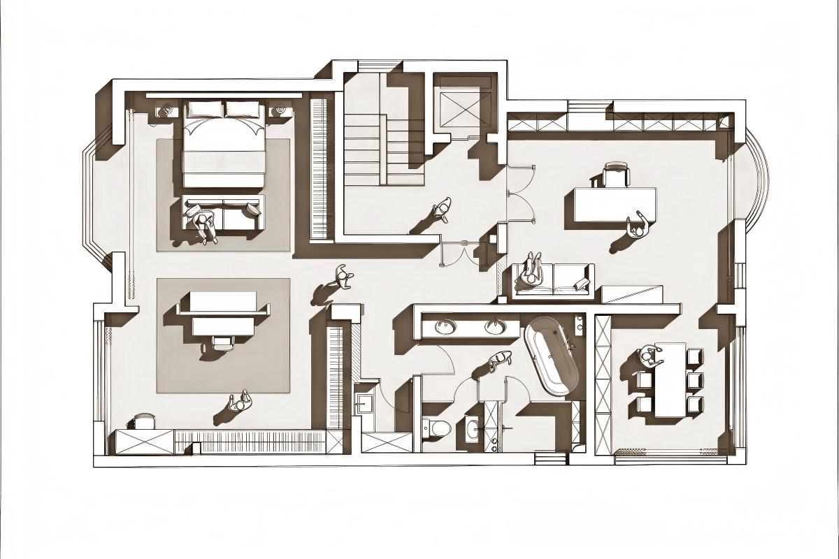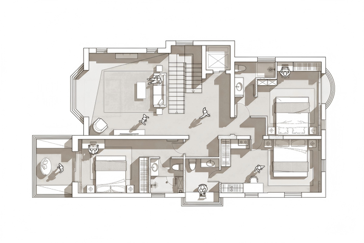 本案以别墅空间为创作基底,核心设计逻辑是让空间气质深度契合男女主人的身份与性情,将生活美学与实用功能完美相融。女业主作为独立女性,干练果敢且对生活质感有着独到的审美主张;男业主身为企业董事长,沉稳睿智兼具开阔的格局与高阶的品味。设计围绕主卧、衣帽区、书房、茶室,以及 F 1与 B1 区双客厅、老人房、儿童房等全维度空间视角展开,秉持删繁就简的手法,摒弃冗余修饰,以利落的空间线条与雅致的质感表达,勾勒出大气简约的整体轮廓,既契合二人的高阶生活追求,又兼顾家庭生活的温馨与多元功能性,让独立女性的精致格调与董事长的沉稳气度,自然融于每一处空间细节。