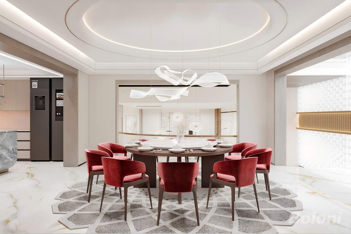 餐厅以团圆社交为设计核心,打造兼具仪式感与温馨氛围的家庭用餐空间。 空间布局舒朗开阔,大尺寸圆桌适配家庭聚餐与亲友宴请,动线与厨房自然衔接,让备餐与用餐更显从容。定制化吊顶灯带与艺术吊灯呼应,营造雅致用餐氛围;红色绒面餐椅与浅调空间形成对比,既显质感又不失温度。地面花砖与全屋大理石纹理相呼应,弱化地下空间封闭感,让用餐场景兼具格调与烟火气,成为承载家庭温情与社交互动的核心场域。