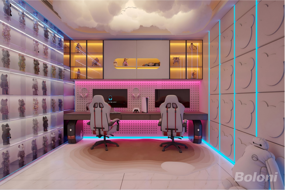 电竞房以潮玩电竞为设计核心,打造兼具沉浸感与收藏属性的专属娱乐空间。 双机位操作台满足双人开黑需求,洞洞板墙面兼顾设备收纳与展示;左侧整墙玻璃柜打造潮玩收藏区,内嵌灯带强化陈列质感。粉蓝霓虹灯带与云朵造型吊顶营造赛博氛围,地面防滑地垫提升久坐舒适度。整体风格潮酷个性,将电竞、收藏、休闲功能融合,成为地下室充满活力的娱乐场域,适配家庭娱乐与好友开黑场景。