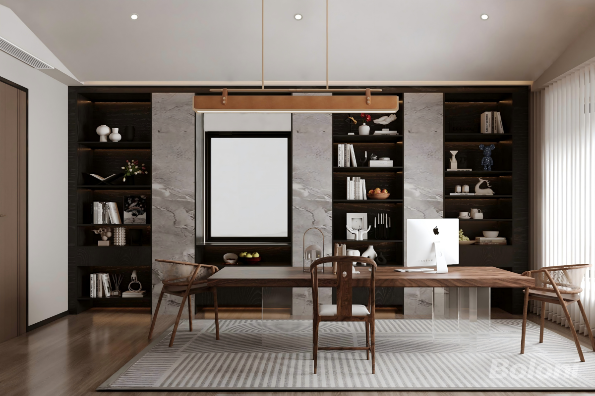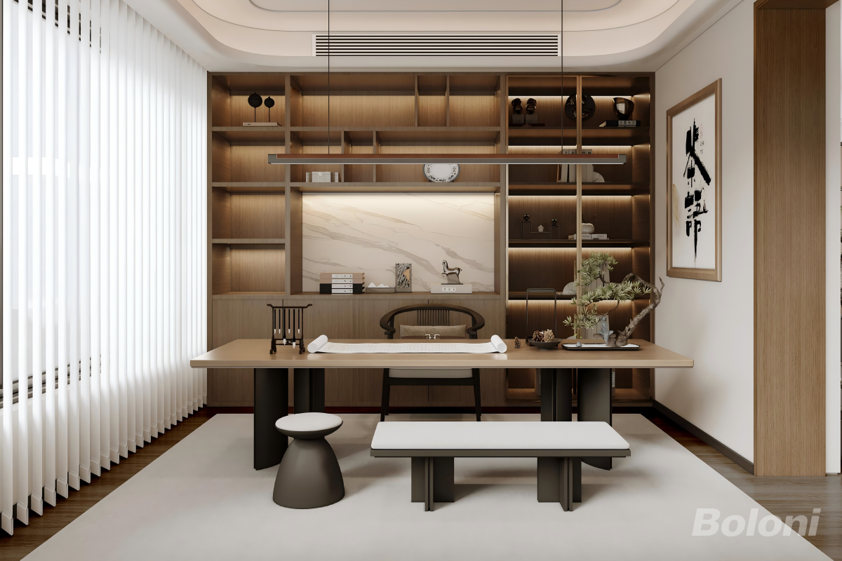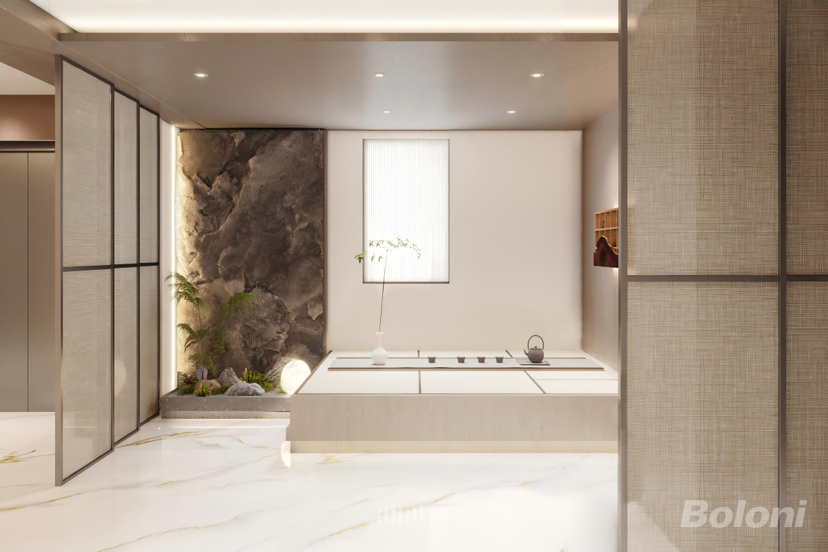 茶室,是主人层中最具东方意韵的精神留白。我们以 “简素为美,留白为境” 为核心,摒弃一切冗余装饰,让空间回归本真。顶天立地的木作柜体采用现场定制,严丝合缝地嵌入空间,既最大化了收纳,又与温润的实木茶桌形成呼应。浅木色的温润、大理石的清雅,与墙上的书法作品相得益彰。在这里,一盏茶、一缕香,便可让人忘却尘世喧嚣,于方寸之间,体悟 “茶禅一味” 的东方哲思。