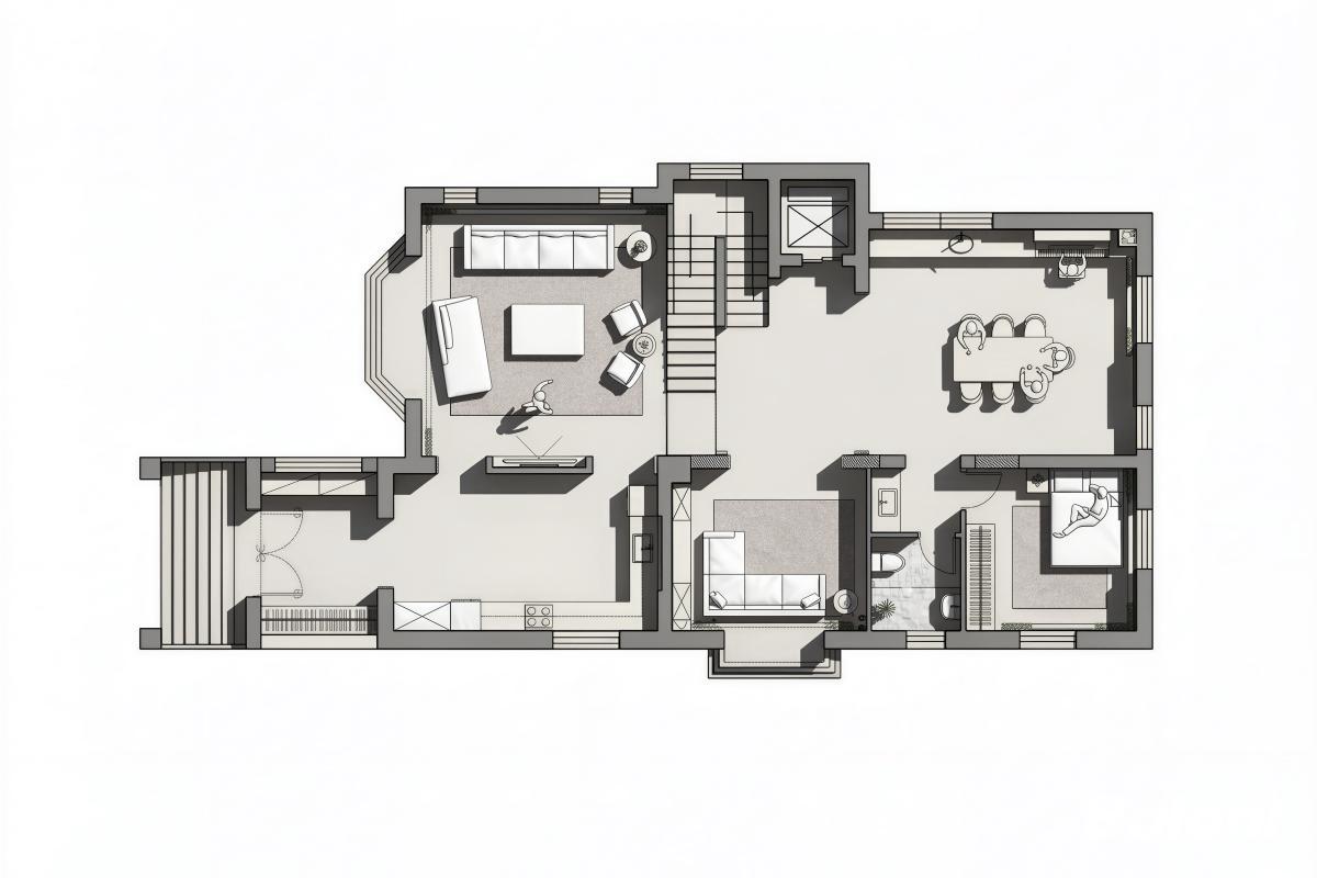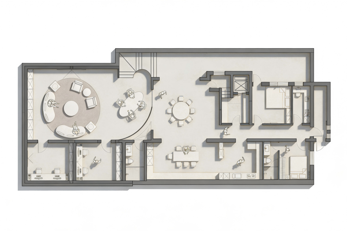 一方雅致的地下一层空间,不必做繁复堆砌,也无需浓艳装饰,唯有契合居者需求的光影巧思,方是最佳的空间营造。本案以开天窗为核心设计手法,打破地下空间的采光桎梏,让自然天光倾泻而入,消融阴暗感,令客厅、餐厅等功能区皆被天光包裹。同时梳理流畅动线,规整功能布局,兼顾待客社交与家庭休闲需求,让地下一层成为通透舒适的生活延伸,藏着贴合居者高阶品味的雅致与惬意。