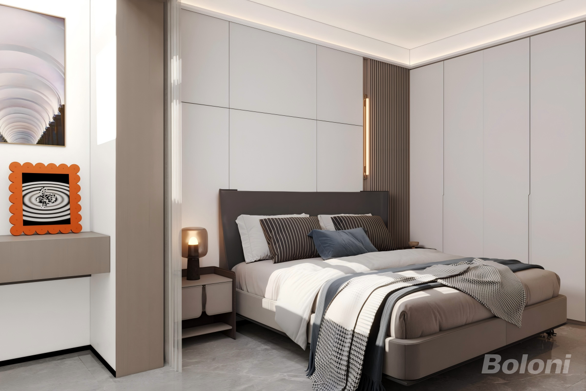 本主卧延续现代简约基调,以浅白与浅木色为基底,呼应男女主人理性而温润的生活态度。利落的嵌入式衣柜与无主灯设计,构建秩序井然的空间秩序;深色床头与金属线条点缀,中和浅调的柔和,强化利落质感。功能上,作为私密休憩区,兼顾高效收纳与舒适体验,暖光床头灯与橙色艺术装饰,在理性秩序中注入生活温度,让简约空间成为身心归处,契合二人内敛而坚定的精神共鸣。