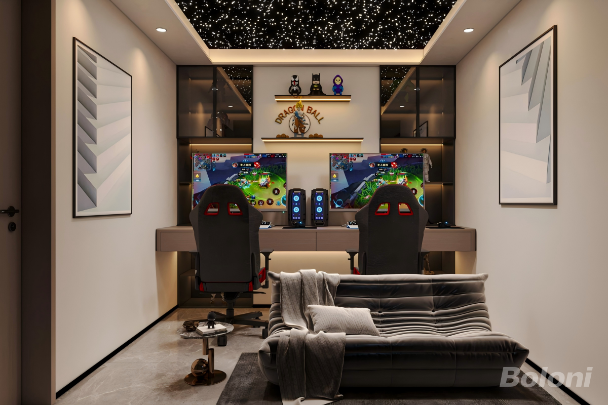 本影音电竞区在现代简约基调下,注入鲜活的个性表达,呼应男女主人理性与趣味兼具的生活态度。星空顶打破空间规整感,营造沉浸式氛围;双电竞位与展示柜以利落线条勾勒,浅木与玻璃材质碰撞,既契合男主人的建筑审美,又满足高效互动需求。动漫手办与软饰点缀,在秩序井然的空间中注入生活温度,功能上兼顾电竞、观影与休憩,让简约空间成为释放自我、共享乐趣的精神自留地。