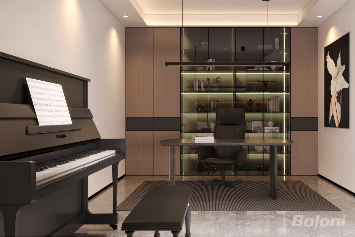 本琴房兼书房以现代简约为基底,呼应男女主人理性与艺术兼具的生活态度。钢琴与书桌分区布局,玻璃展示柜兼顾收纳与展示,利落线条与浅木、玻璃、金属材质碰撞,中和冷硬质感。无主灯设计搭配嵌入式灯带,营造静谧氛围,既满足音乐创作的沉浸感,也适配办公阅读的专注需求。在秩序井然的空间中,藏纳精神共鸣,契合二人内敛而坚定的精神世界。