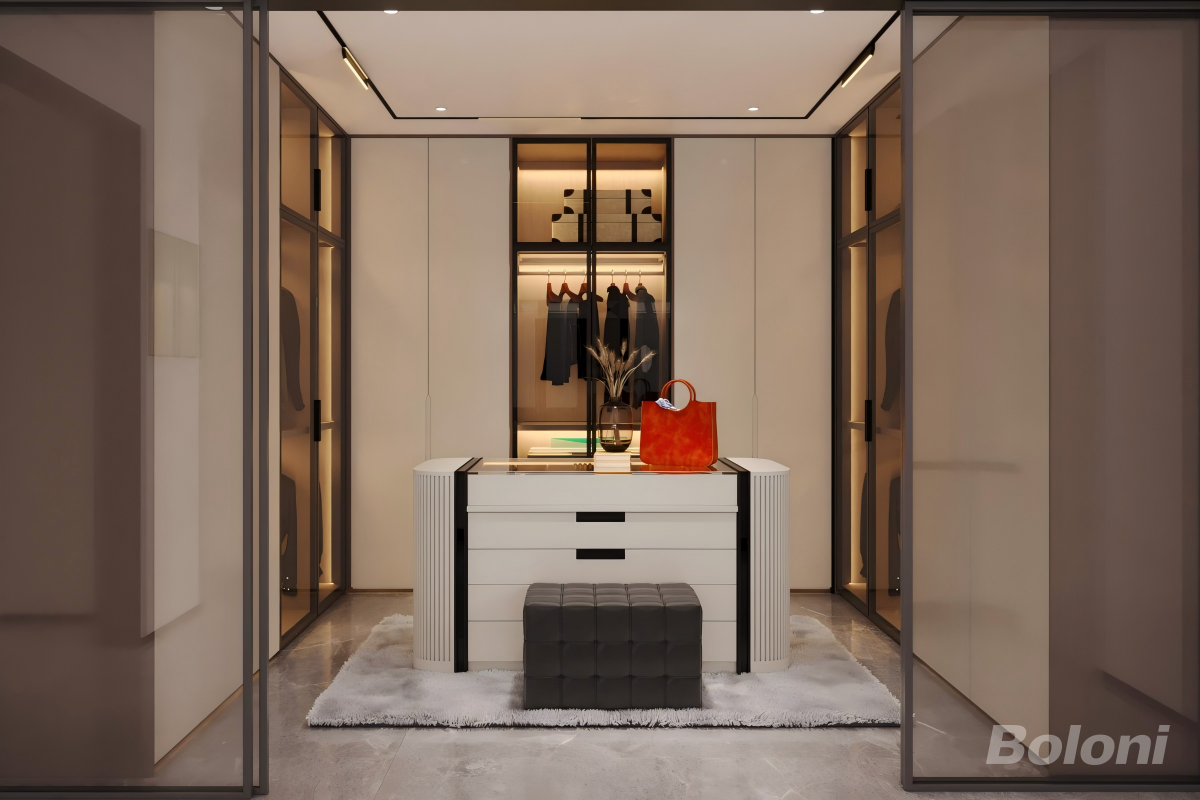 本衣帽间梳妆区紧扣现代简约内核,精准契合女主人雷厉风行的处事风格与二人的理性审美。玻璃通透柜体搭配嵌入式灯带,兼顾收纳展示与秩序感,呼应男主人的建筑线条美学。中岛梳妆台以利落线条勾勒轮廓,黑白撞色与橙色配饰点睛,在温润的浅木基底中注入精致活力。无主灯设计营造柔和光影,既满足高效梳妆的功能需求,又以规整布局与细节质感,打造出兼具仪式感与实用性的私享收纳空间。