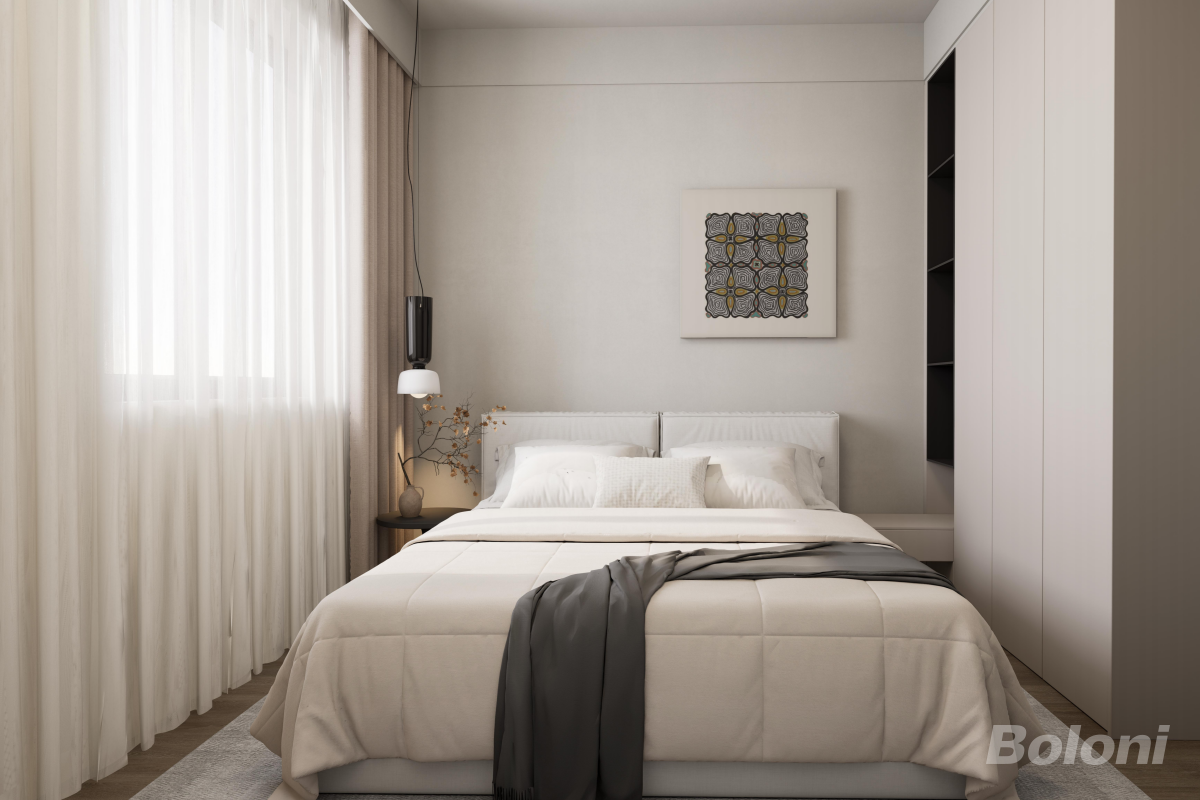 本次卧延续现代简约基调,以浅米白与原木色为基底,营造温润静谧的休憩氛围。利落的嵌入式衣柜与无主灯设计,构建秩序井然的空间秩序;浅木色地板与双层纱帘,柔化光线并引入自然质感。功能上,作为私密休憩区,兼顾高效收纳与舒适体验,暖光床头灯与艺术装饰,在理性秩序中注入生活温度,让简约空间成为身心归处,契合二人内敛而坚定的精神共鸣。