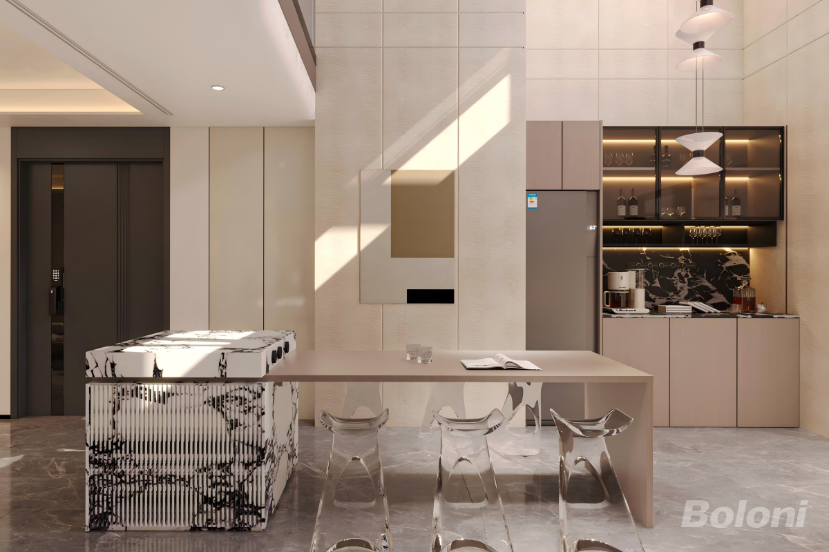 本餐厨岛台作为空间核心,延续现代简约基调,呼应男女主人理性而有温度的生活态度。宝格丽大理石岛台以黑白纹理与金属竖条碰撞,搭配透明亚克力餐椅,轻盈通透;浅木色橱柜与嵌入式灯带酒柜,在冷硬材质中注入温润质感,提升精致度。功能上,它既是高效备餐的操作区,也是二人交流、友人小聚的社交场,利落线条与纯粹材质,在秩序感中藏纳生活温情,契合他们对家的坚定表达。