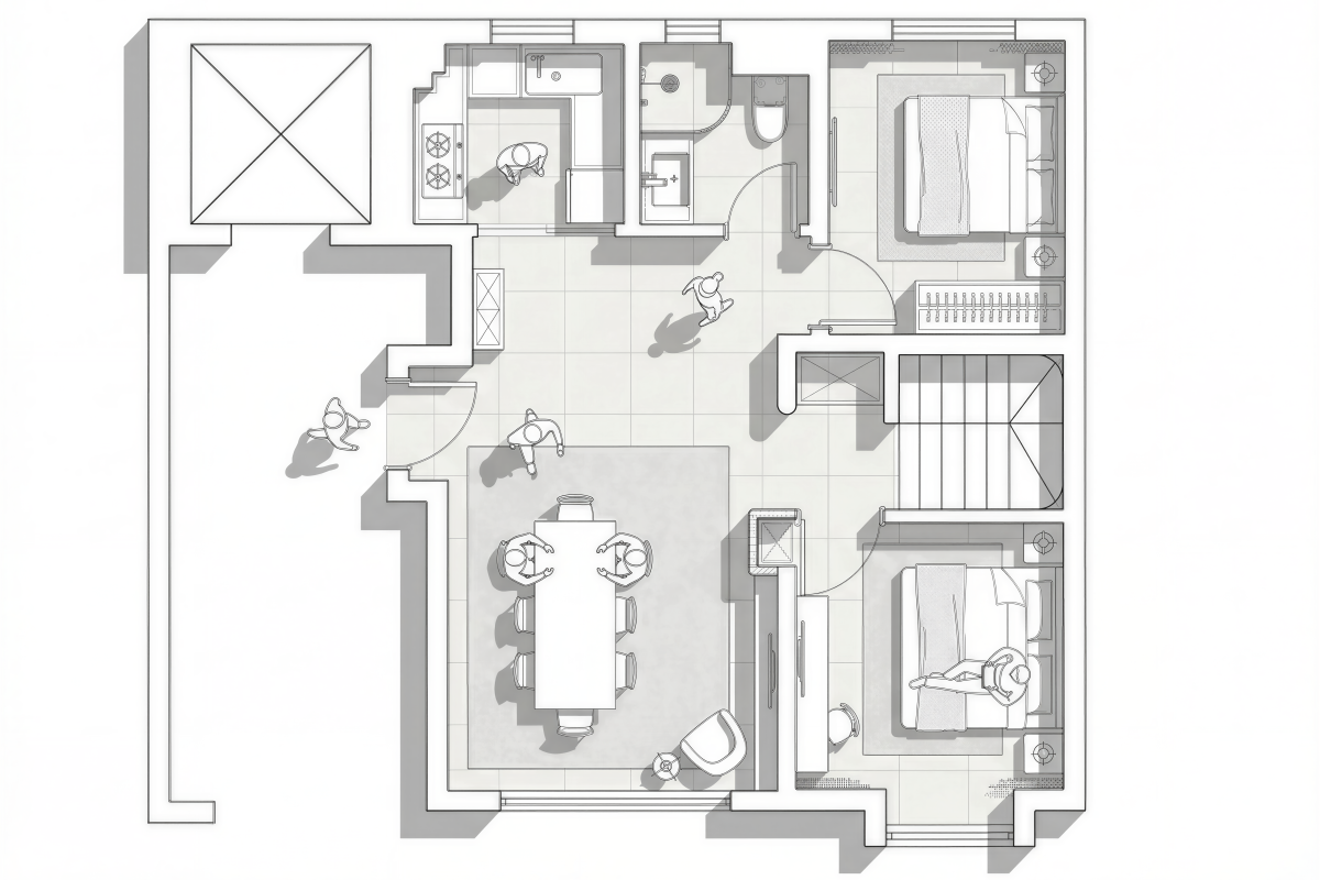 本挑空会客区以现代简约为基调,呼应男女主人研究生的理性审美与生活态度。双层挑空结构打破空间局限,最大化引入自然光,营造开阔通透的纵深感。设计以利落直线为骨,浅灰大理石地面与米白墙面奠定简约基调,浅木饰面与金属线条点缀其间,中和冷硬质感。无主灯设计搭配嵌入式灯带,让光影层次分明。功能上,会客区与餐厨区自然衔接,开放式布局既满足二人闲坐交流的静谧时光,也能承载友人小聚的温馨时刻,在规整秩序中藏纳生活。