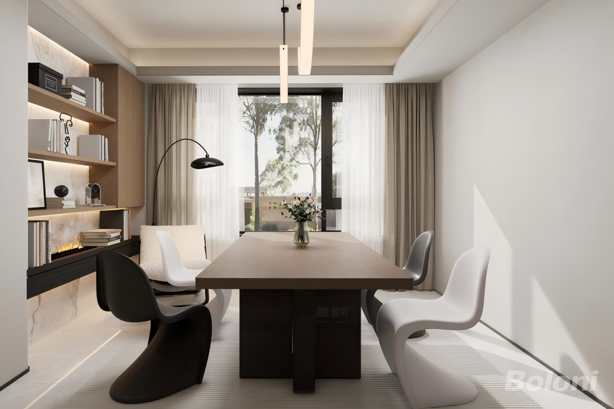 本书房延续现代简约基调,以浅木与黑白为核心色调,呼应男女主人理性而温润的生活态度。整面嵌入式书架与壁炉设计,将收纳与氛围营造融为一体,利落线条勾勒秩序感;黑白造型椅与木色餐桌碰撞,弱化空间厚重感,注入艺术张力。大窗引入自然光线,无主灯设计搭配线性吊灯,让光影层次分明,既适配二人日常办公阅读的专注,也能承载交流思考的静谧,在秩序中藏纳生活温情。