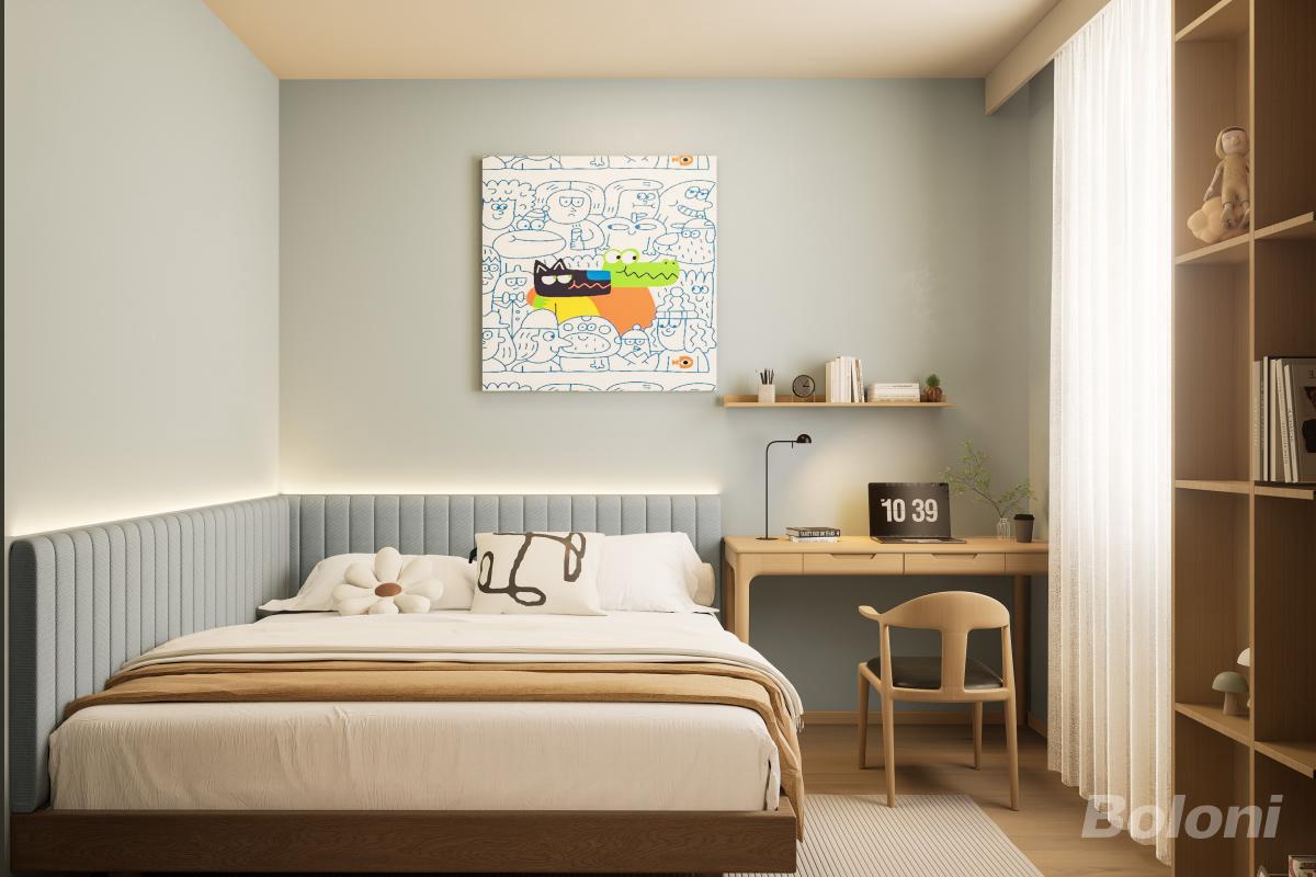 本卧室以 “松弛休憩与轻办公共生” 为核心,适配孩子的日常需求。 低饱和浅蓝墙面搭配竖纹软包床头,弱化视觉重量,床头暗藏灯带勾勒柔和氛围,为高强度工作后的深度休憩提供保障。书桌与开放书架整合,满足睡前阅读或轻办公需求;原木家具与布艺软装平衡科技感,让理性与温暖自然融合,成为高效工作与静谧休憩的过渡容器。