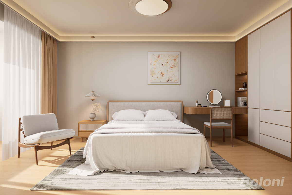 本卧室以 “静谧休憩与轻妆办公共生” 为核心,为程序员夫妇打造高效与松弛并存的空间。 浅灰墙面搭配原木家具,弱化视觉重量;床头线性灯带与柔和吊灯勾勒静谧氛围,为高强度工作后的深度休憩提供保障。悬浮梳妆台与整面收纳柜整合,满足轻办公与衣物收纳需求;浅色系软装平衡科技感,让理性布局与生活温度自然融合,成为高效工作与静谧休憩的过渡容器。
