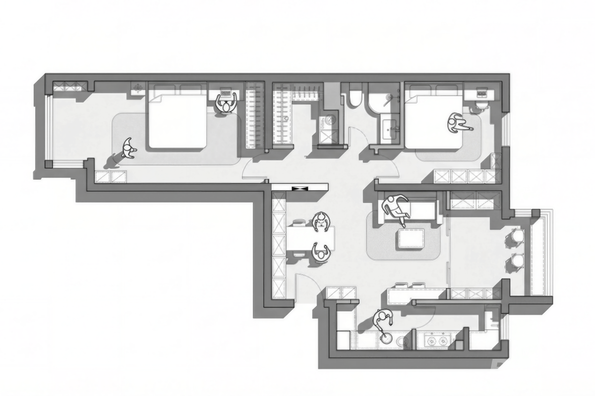 为程序员夫妇打造高效居所,**L型动线串联餐厨、双办公区与双卧休憩区**,以玻璃隔断实现空间通透与功能独立。 开放式吧台衔接客餐厨,隐形床灵活切换办公/睡眠模式,定制收纳规整设备与素材。原木浅灰基调搭配线性光,让理性布局与松弛氛围共生。