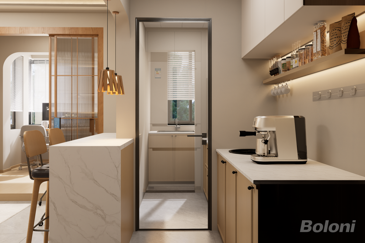 本空间作为餐厨与办公区的过渡节点,以 “高效与仪式感共生” 为核心,服务于程序员夫妇的日常。 开放式吧台衔接咖啡角与双工位办公区,玻璃移门分隔厨卫,既保证空间通透,又实现功能独立。原木柜体搭配大理石台面,线性灯带勾勒层次,营造温暖克制的氛围。咖啡角满足晨间仪式感,吧台可作临时办公或轻食区,开放收纳规整设备与食材,适配高频居家办公与休闲需求,让理性布局与生活温度自然融合。