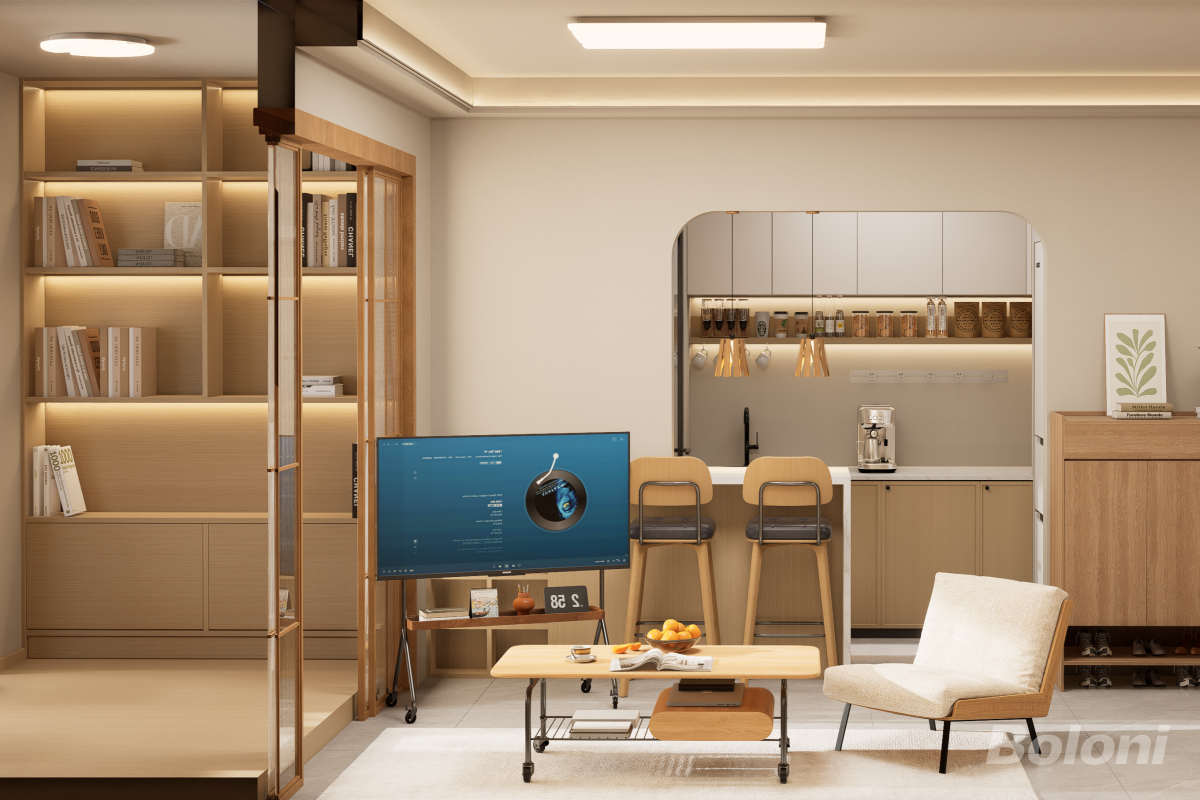 开放书架与玻璃移门划分办公与休闲区,吧台衔接咖啡角与客厅,移动电视与可移动茶几适配灵活场景。原木与浅灰基调搭配线性灯带,弱化边界提升通透感,既满足设备收纳、轻办公需求,又为休闲娱乐提供松弛容器,让理性布局与生活温度自然融合。