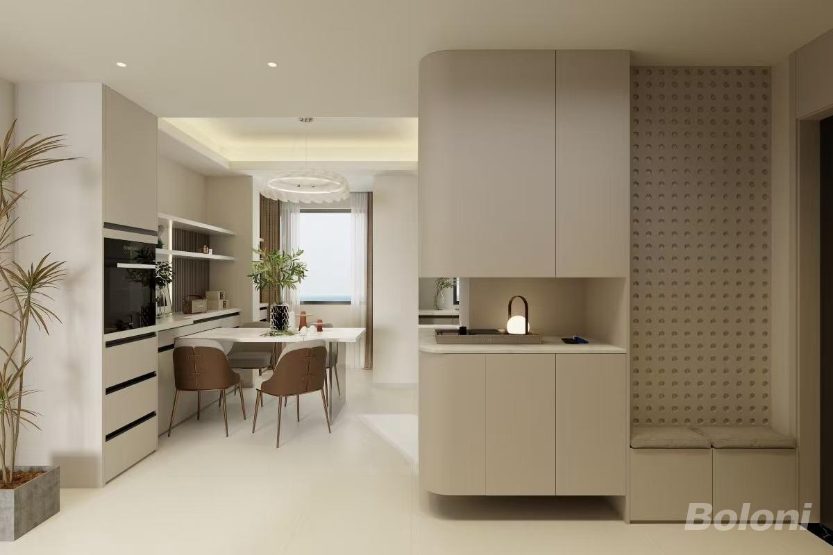 一体化的设计,收纳空间超大。门口的换鞋凳方便又舒适,上方的开放式区域可以摆放装饰品,还能根据自己的喜好更换布置,好看又实用。