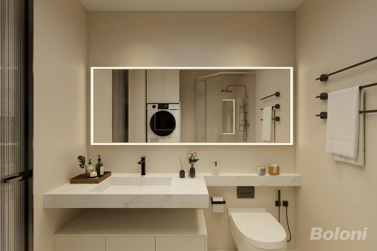 浅灰色瓷砖铺满墙面,自带质感滤镜,搭配黑框淋浴间和黑色五金件,极简又高级,大镜子让空间视觉上更开阔,搭配上壁灯的暖光,整个浴室显得温馨又浪漫。