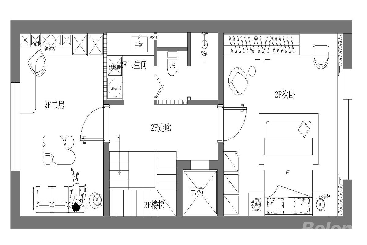 这是一张住宅二层平面布局图,清晰划分了功能区域,整体动线流畅,兼顾了私密与公共需求。 位于左侧,是独立安静的工作区。 沙发、休闲座椅、洞洞板收纳墙,适合办公与放松。 与卧室区分离,避免噪音干扰,采光良好。