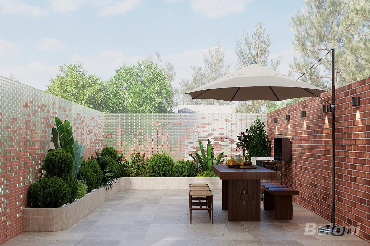 米白色模块沙发为视觉中心,搭配圆形木质茶几与艺术地毯,界定出舒适的会客与放松区域。 左侧通过拱形门洞连接其他空间,胡桃木藤编柜与高柜组合,兼顾收纳与展示功能。 拱形窗引入自然光,红砖墙面与白色窗帘形成复古质感,让空间更具层次。